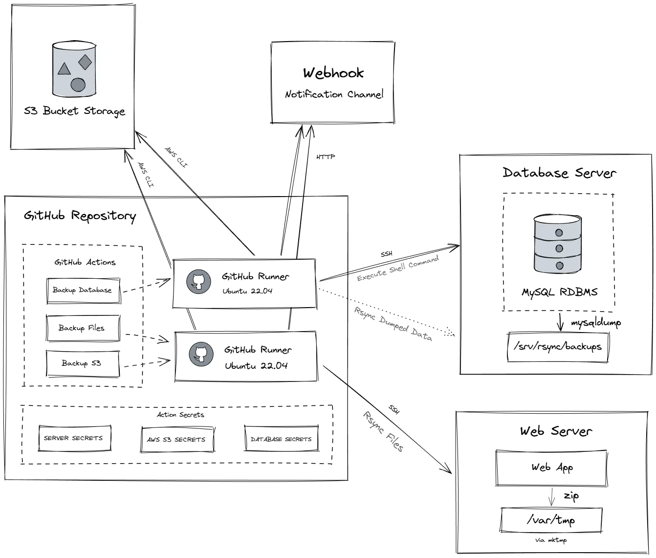 Uses AWS-compatible S3 storage to store application databases and filesystem backup snapshots and retains only a specified count of backups to prevent storage overflow. The pipeline pushes metrics to a MySQL database which can be scaped for monitoring.